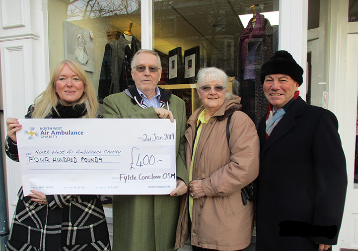 | On the morning, 2nd of January 2019, at the Shop and Local Office of the North West Air Ambulance Charity in Clifton Street, Lytham, the Immediate Past S.R. of Fylde Conclave O.S.M. Wy Bro Bryan Snaith presented Ms Lynne Whittaker the Regional Fundraiser of the Charity with a cheque for £400. |