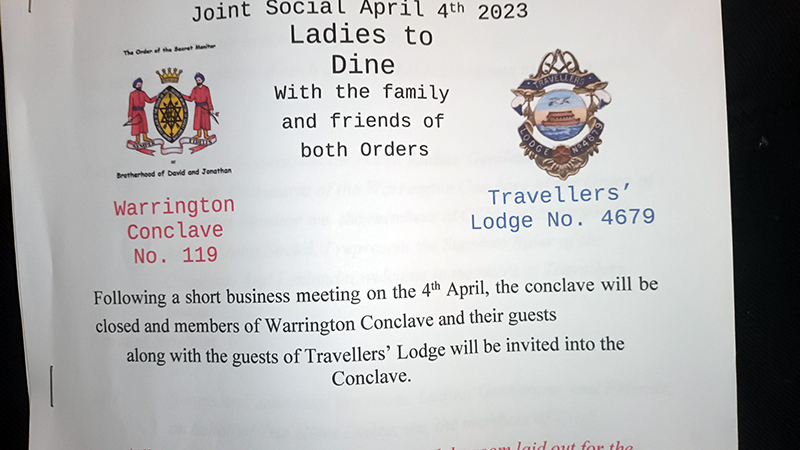| Following a short business meeting on the 4th April where the main business was to elect Wy. Bro. Raymond Whitticombe as the Supreme Ruler for the ensuing year the conclave was closed and members of Warrington Conclave No 119, their partners, family and friends along with guests of Travellers Lodge No 4679 who had expressed an interest in hearing more about the order were invited into the conclave. | ||