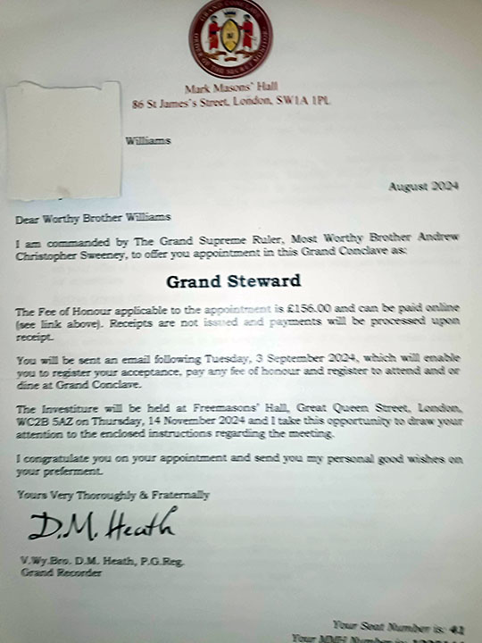 For one brother in particular this first visit to Grand Conclave carried a profound significance as Wy Bro Bob Williams of Warrington Conclave No119 was to be invested with the high honour of a serving Grand Steward.