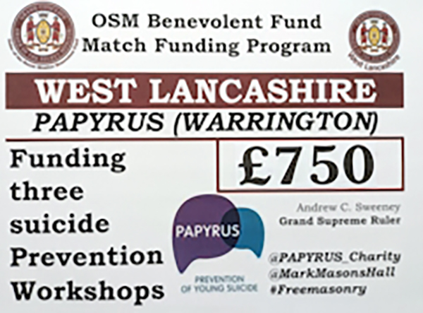 | Whilst we may be in the summer recess for masonic meetings our key principles remain with us all of the year round, and in-line with our core value of supporting good causes Worthy Bro. Bob Williams a member of Warrington Conclave No 119 had the pleasure of representing the Supreme Ruler for the Province of West Lancashire: Right Worthy Bro. John Charles Bicknell, by visiting the head-quarters of Papyrus in Warrington to present a cheque for £250 which had been donated by the OSM Benevolent Fund as part of their “match funding” programme following a previous donation of £500 from the Province of West Lancashire Order of the Secret Monitor last October. |